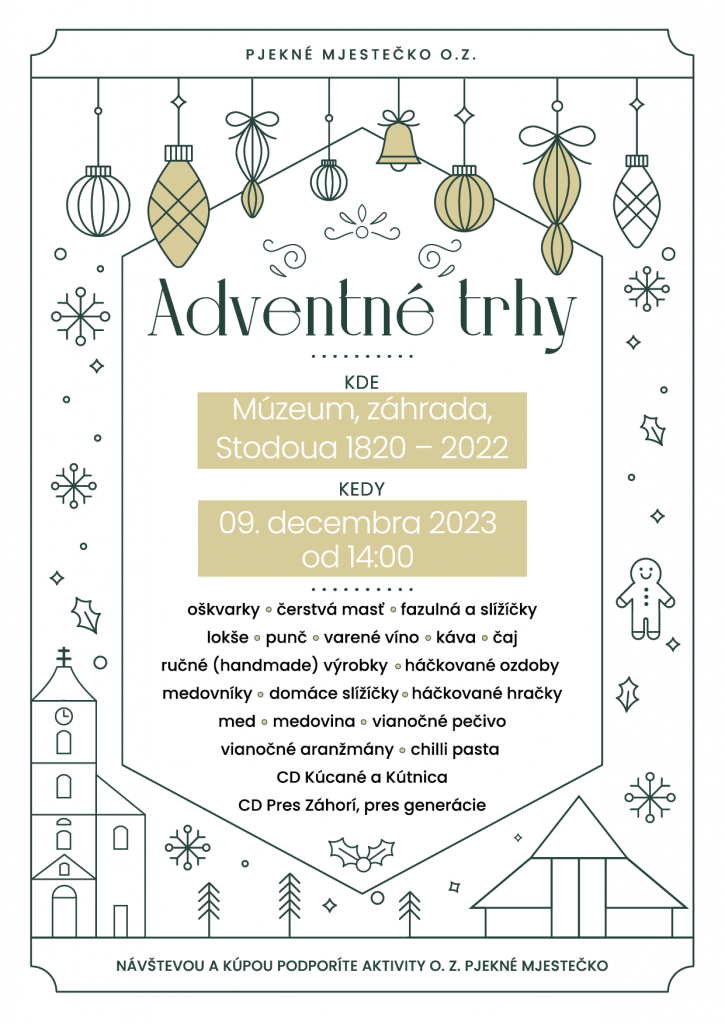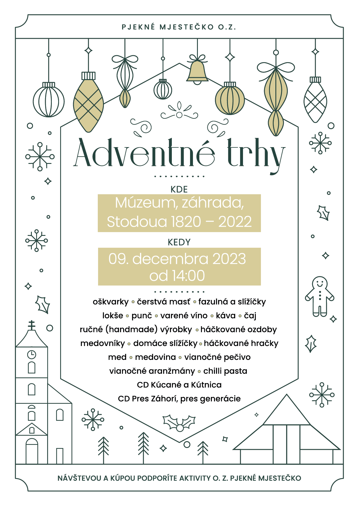 Občianske združenie Pjekné mjestečko Vás srdečne pozýva aj tento rok na adventný trh, ktorý sa uskutoční v sobotu 9. decembra 2023 od 14:00 v Stodole a záhrade múzea.