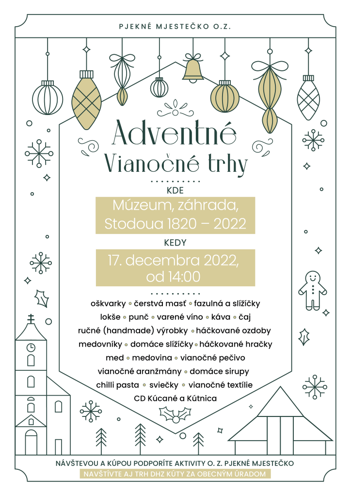 Občianske združenie Pjekné mjestečko Vás srdečne pozýva na Adventný trh, ktorý sa bude konať v Stodole a záhrade Múzea v sobotu 17. decembra 2022 od 14. hodiny.