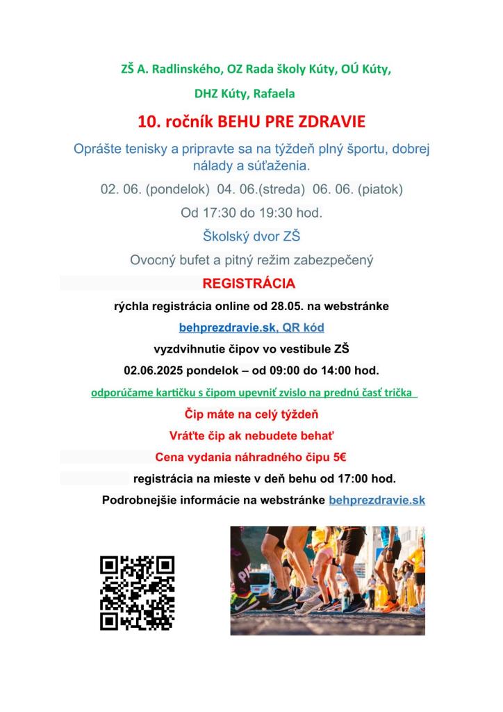 ZŠ A. Radlinského v spolupráci s občianskym združením Rada školy Kúty a obecným úradom Kúty Vás pozývajú na 10. ročník Behu pre zdravie, ktorý sa uskutoční v dňoch 02.06. – pondelok, 04.06. - streda a 06.06. v piatok v priestoroch školského dvora základnej školy. Účastníci behu sa musia zaregistrovať na web stránke www.behprezdravie.sk . Podrobnejšie informácie nájdete na web stránke školy. Tešíme sa na Vašu účasť.