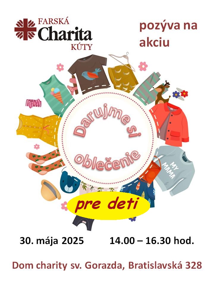 Farská charita vás pozýva na akciu „Darujme si oblečenie pre deti“. Môžete si prísť vybrať oblečenie pre deti a mládež v piatok 30. mája 2025 v čase od 14.00 do 16.30 hod. do Domu charity sv. Gorazda.