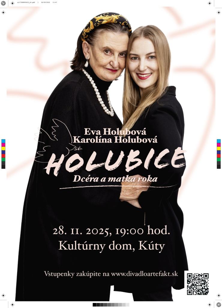 Známa a obľúbená česká herečka Eva Holubová príde do Kútov so svojou zábavnou talkshow Holubice. V piatok 28. novembra sa v jej spoločnosti v kinosále na Obecnom úrade v Kútoch ponoríte do zákulisia šoubiznisu, nazriete do tajov hereckého života a spoznáte historky z placu aj mimo neho priamo z prvej ruky. Čakajú nás vtipné príhody, kariérne vzostupy aj osobné pošmyknutia namiešané do jedného konverzačného koktejlu, ktorý bude podávať Eva Holubová spolu so svojou dcérou Karolínou v úlohe moderátorky. Jedinečný večer plný zábavy sa uskutoční v piatok 28. novembra v kinosále na Obecnom úrade v Kútoch. Vstupenky si môžete zakúpiť https://tootoot.fm/sk/events/685bbd6d654f99b6b0164283
