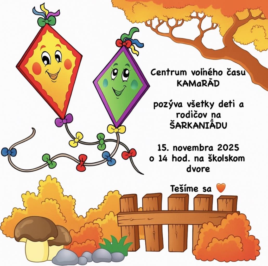 Centrum voľného času KAMaRÁD pozýva všetky deti a rodičov na Šarkaniádu dňa 15.novembra 2025, t.j. v sobotu o 14:00 hod. na školskom dvore ZŠ A. Radlinského.