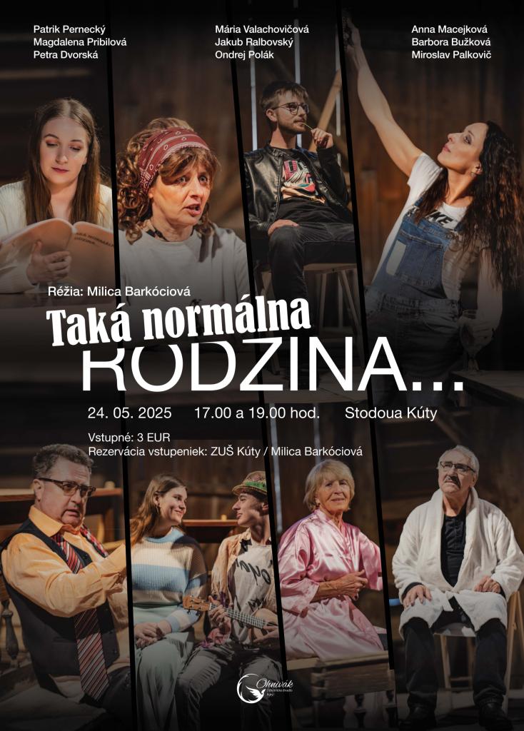 Novozaložené ochotnícke divadlo OHNIVÁK Vás pozýva na premiérové predstavenie s názvom "Taká normálna RODZINA...", ktoré sa bude konať dňa 24.mája 2025 v Stodole pri múzeu v Kútoch. Z kapacitných dôvodov sa predstavenia konajú dve o 17:00 hod. a 19:00 hod..Vstupenky na predstavenie si môžete zakúpiť v Základnej umeleckej škole Kúty u p. riaditeľky Barkóciovej. Cena vstupenky je 3 Eurá.