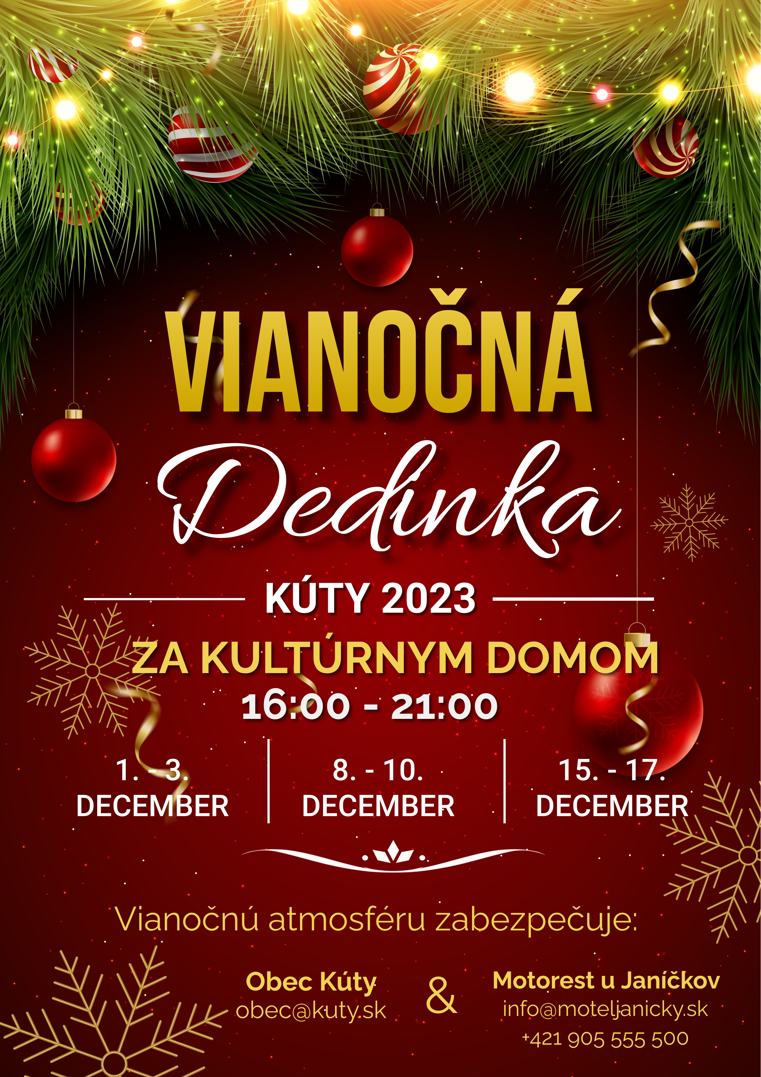 Obec Kúty a Motorest u Janíčkov Vás pozývajú na Vianočnú dedinku, ktorá sa bude konať aj tento víkend od piatka do nedele v čase od 16:00 hod. do 21.00 hod. za kultúrnym domom v Kútoch. Pripravená je vianočná výzdoba, výborné občerstvenie, stánky s vianočnou tematikou a kolotoč pre deti.